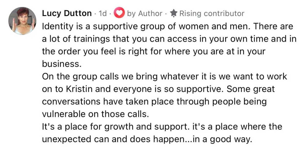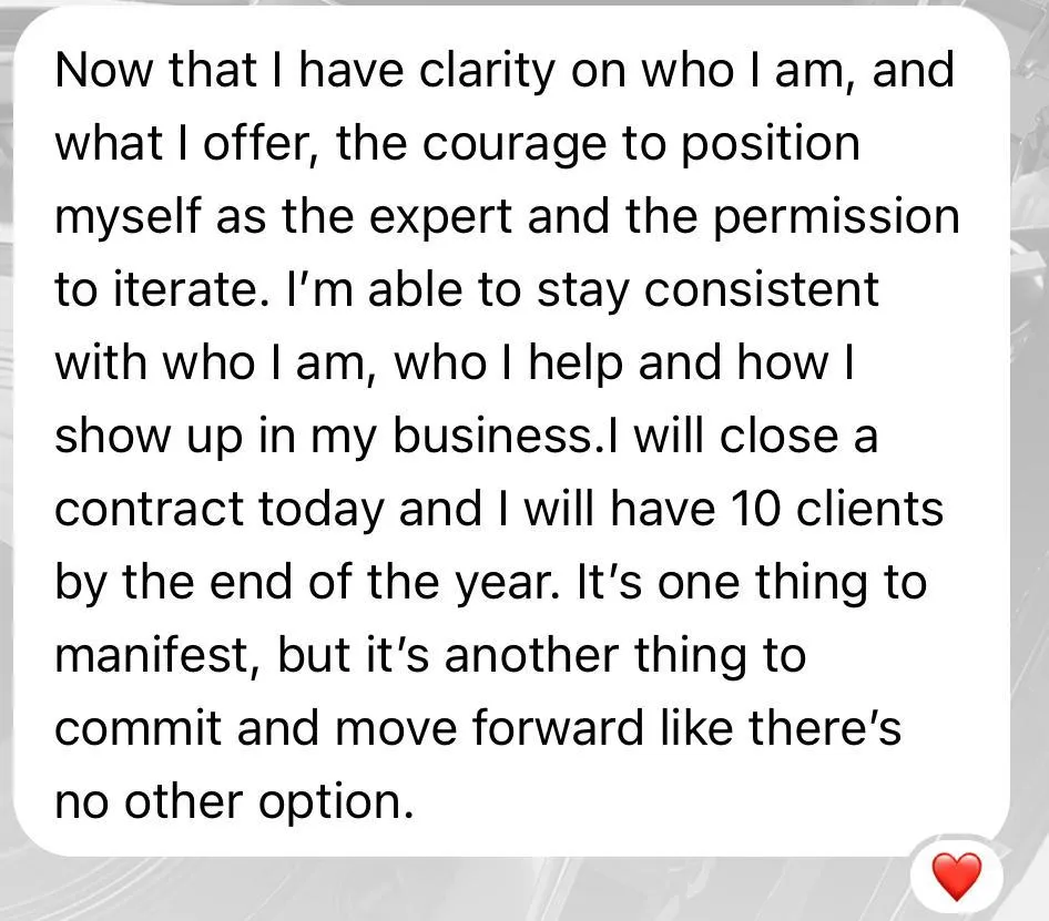 It’s about becoming more fully yourself. The version of you who stops circling the same edge. The version of you who trusts what’s in their heart enough to build around it. The version of you who knows your work is valuable and is willing to package it, sell it, and lead with it. The version of you who moves before certainty. The version of you who lets visibility refine you instead of waiting to feel fearless first. Inside IDENTITY, we blend business strategy, authentic leadership, and brave execution so you can build a business that reflects who you actually are and where you’re actually going. Because your next level likely isn’t asking for more hiding. It’s asking for more truth.